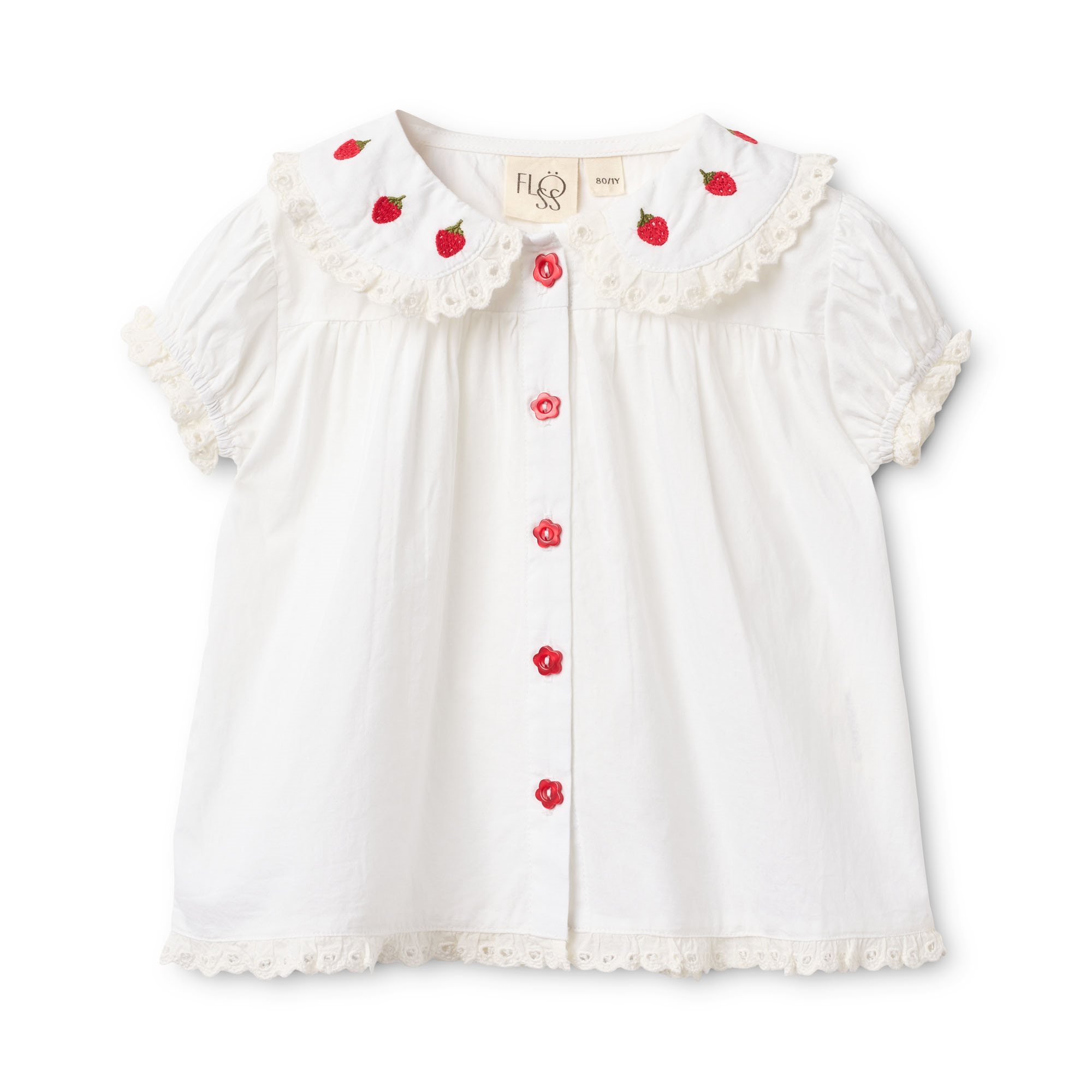 It features a Peter Pan collar with strawberry embroideries, a gathered yoke, and puffer sleeves. The blouse has lace details at collar, sleeves, and the bottom hem. At front is a button closure with round plastic buttons.