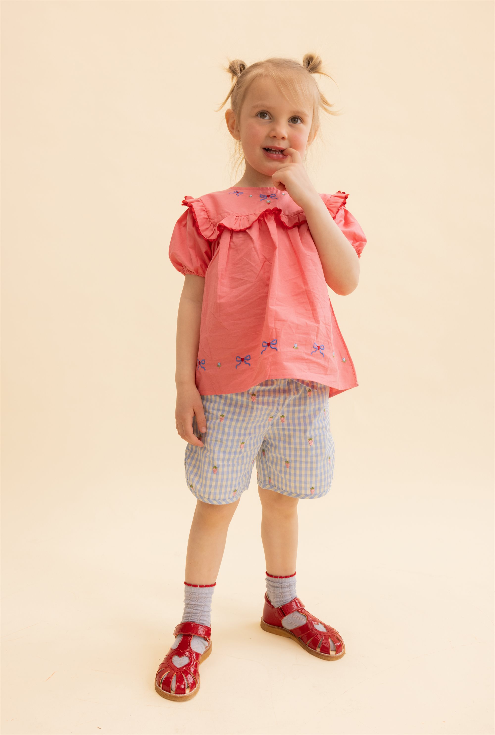 Rosa Blouse is in 100% cotton with cute embroideries along neckline and bottom hem. The blouse has an a-shaped fit, puffer sleeves with elastic hem and flower-shaped buttons at back.