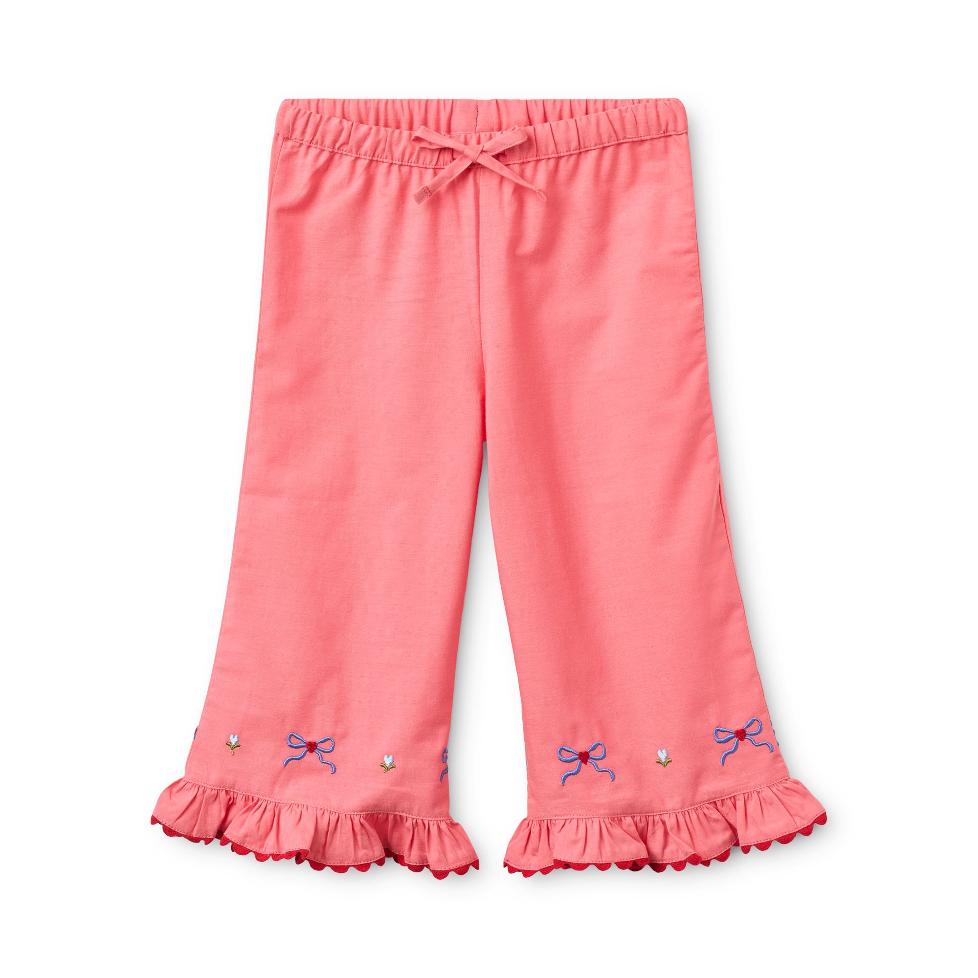 Rosa Pants are in 100% cotton with cute embroideries along bottom hem. The pants have a relaxed wide leg fit and elastic waistband with string.