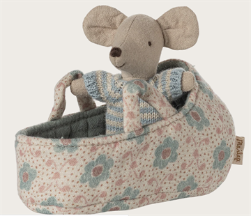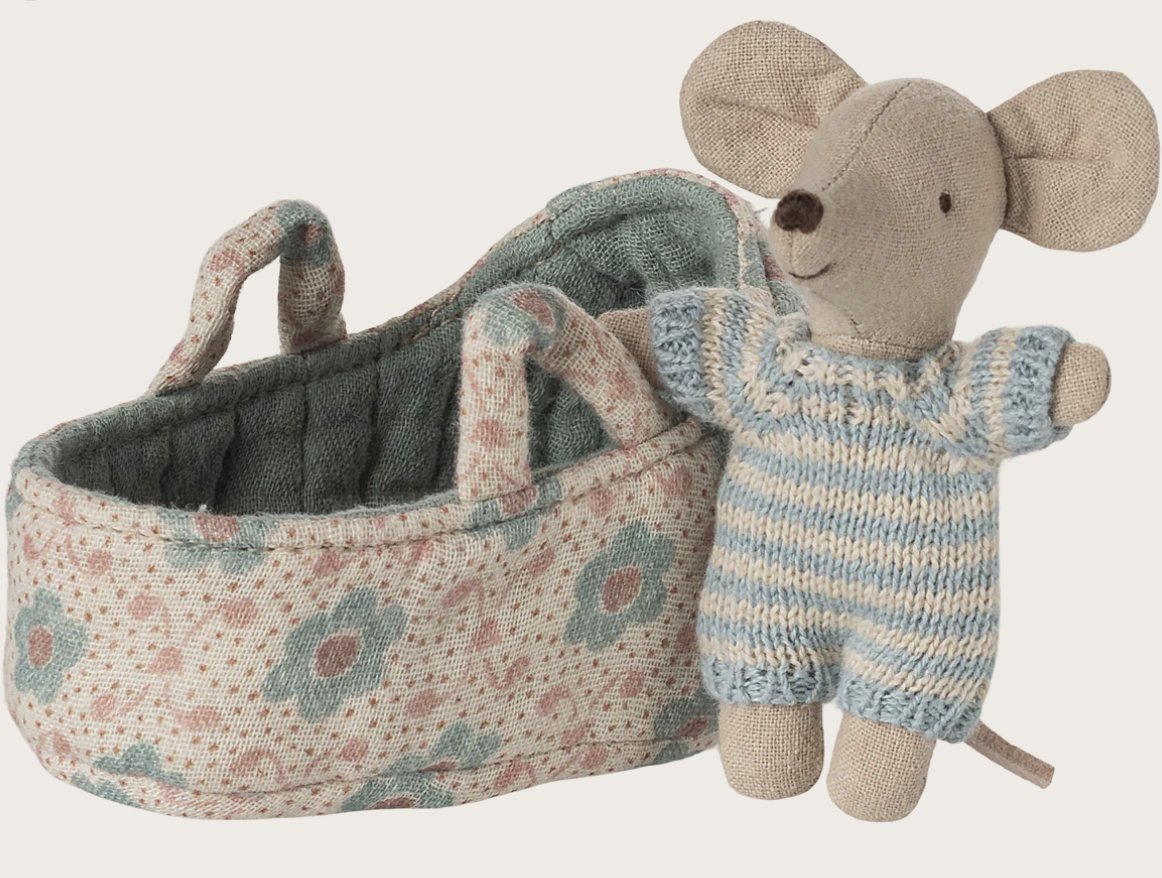 A small baby mouse in a soft and striped knitted suit. It sleeps for hours in its little quilted carry cot.