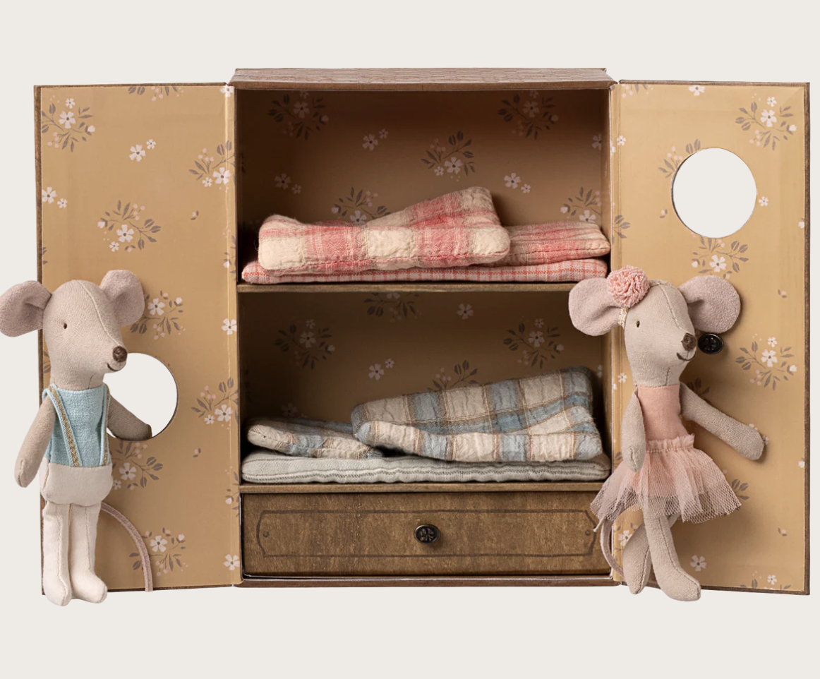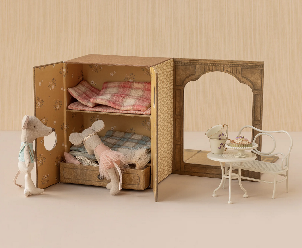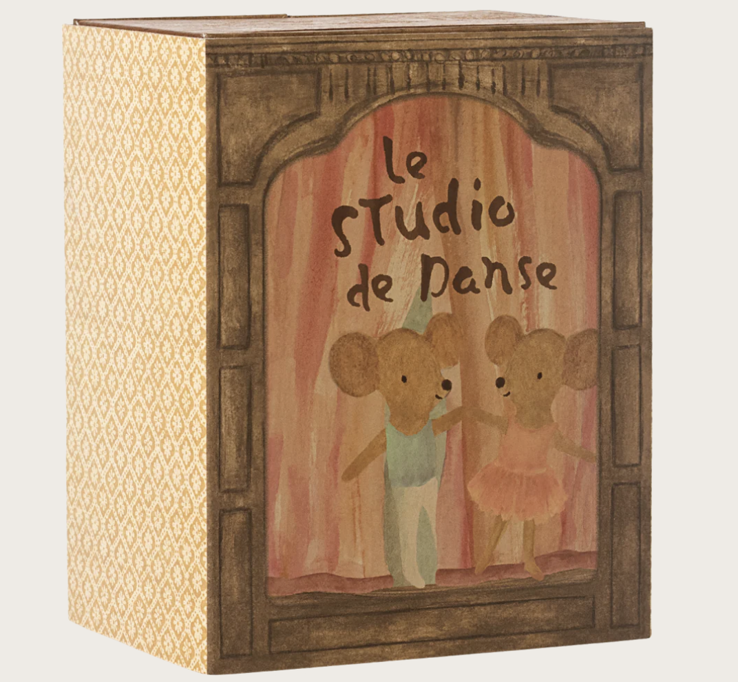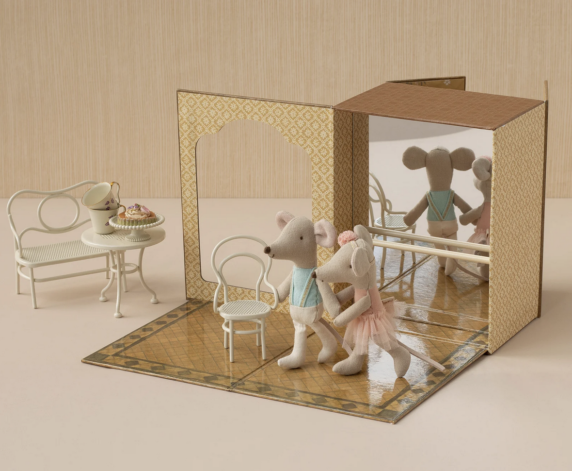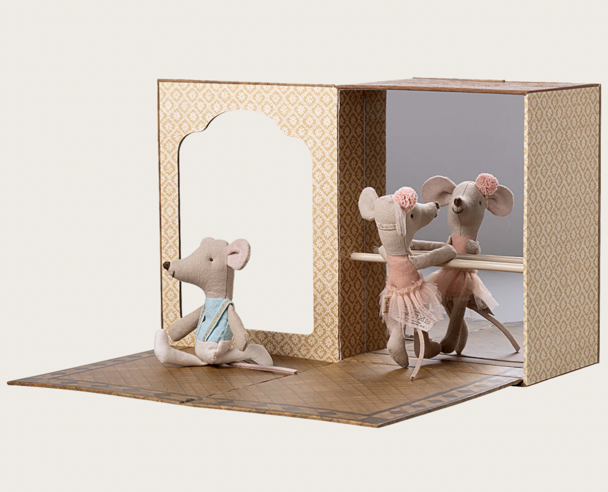 Open the doors of this magical playset and explore a world of dance, stardust and storytelling. This enchanting set transforms from a cosy mouse house to a ballet studio where dreams take centre stage. The mirrored wall glimmers while the magnetic barre secures every tiny paw as the mice rehearse their grand performance. Two ballet mice, already dressed for the spotlight, wait eagerly in their beds, ready to twirl and tell their stories on stage
