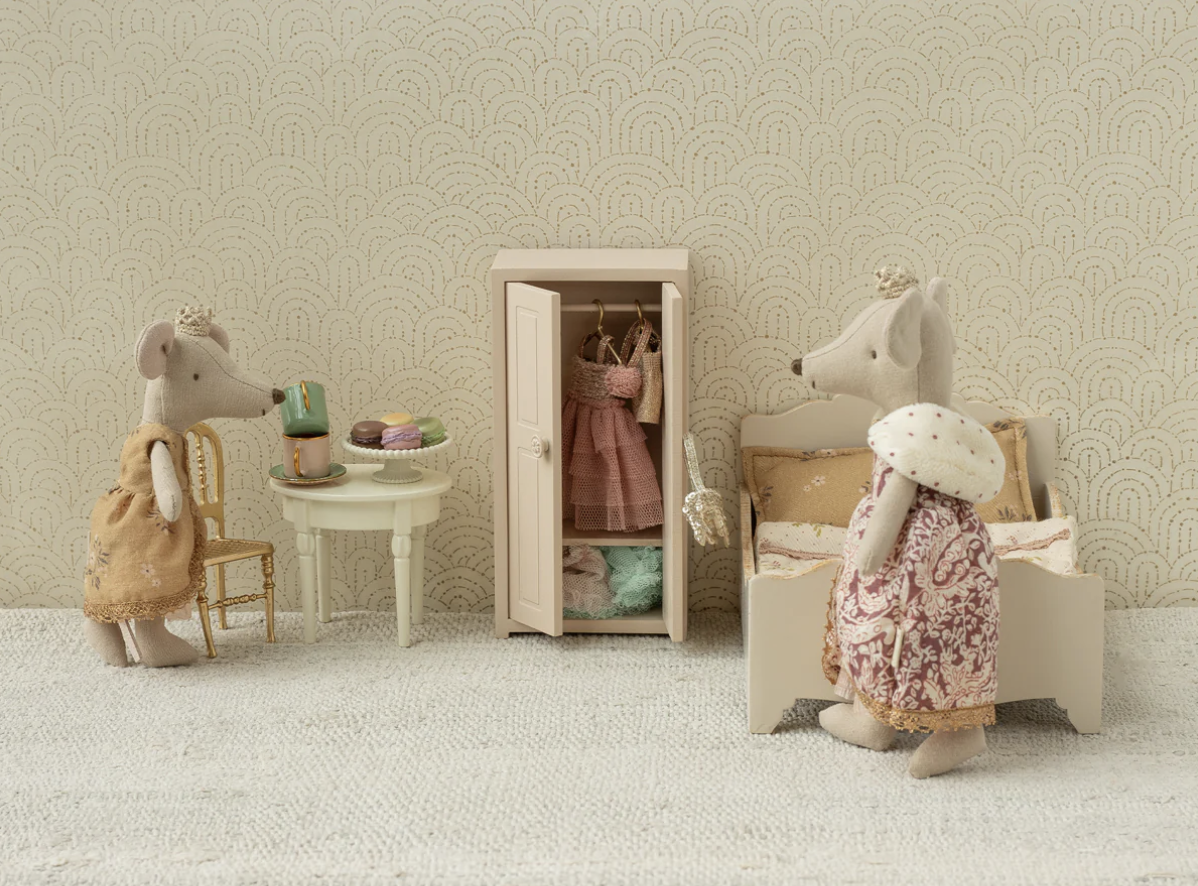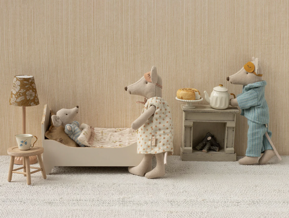 The perfect bed for a good nights sleep. This bed has beautiful small details such as golden finish on the wood and beautiful collected fabrics for bedlinen. Two mice can easily sleep side by side as it fits up to Grandma and Grandpa mice.