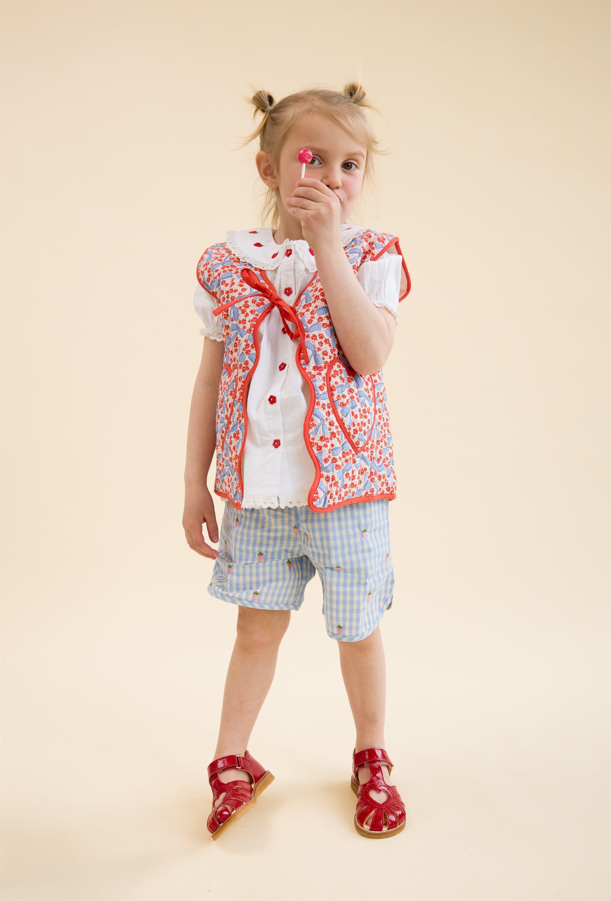 Debbie Vest is a quilted cotton vest with a cute bow print. The vest has contrast edges, heart shaped patch pockets and closes with two strings at front.