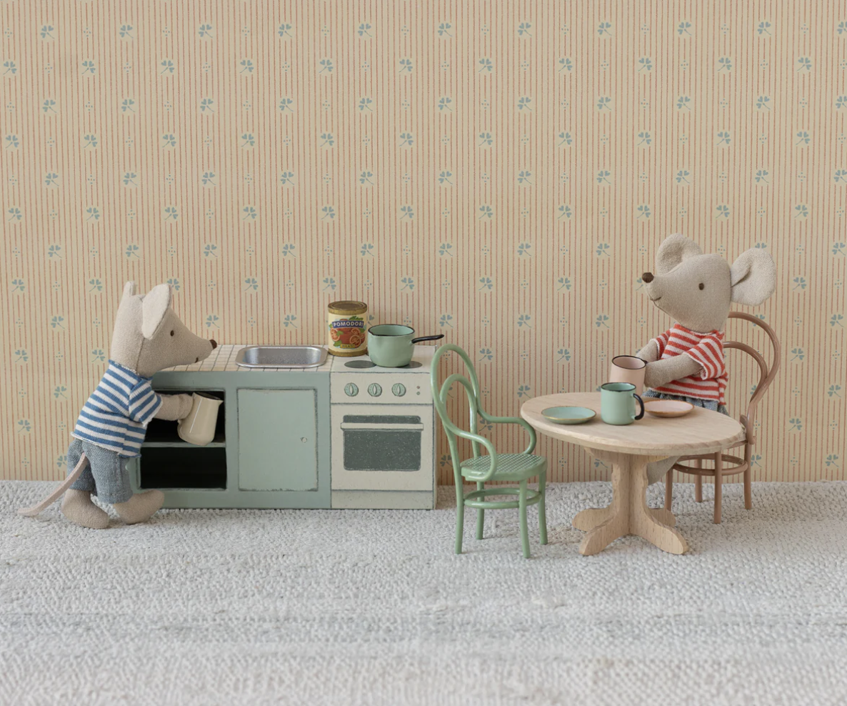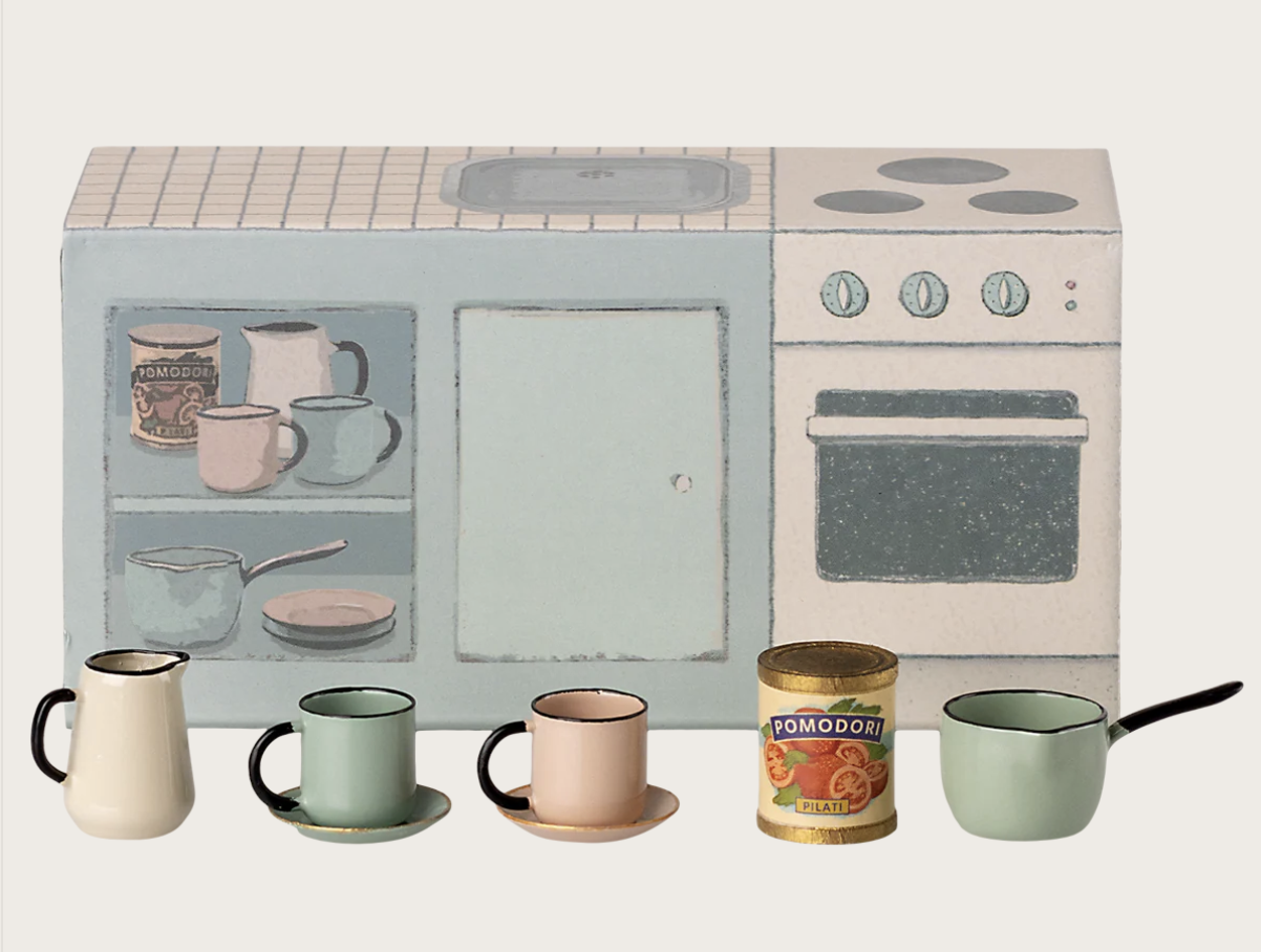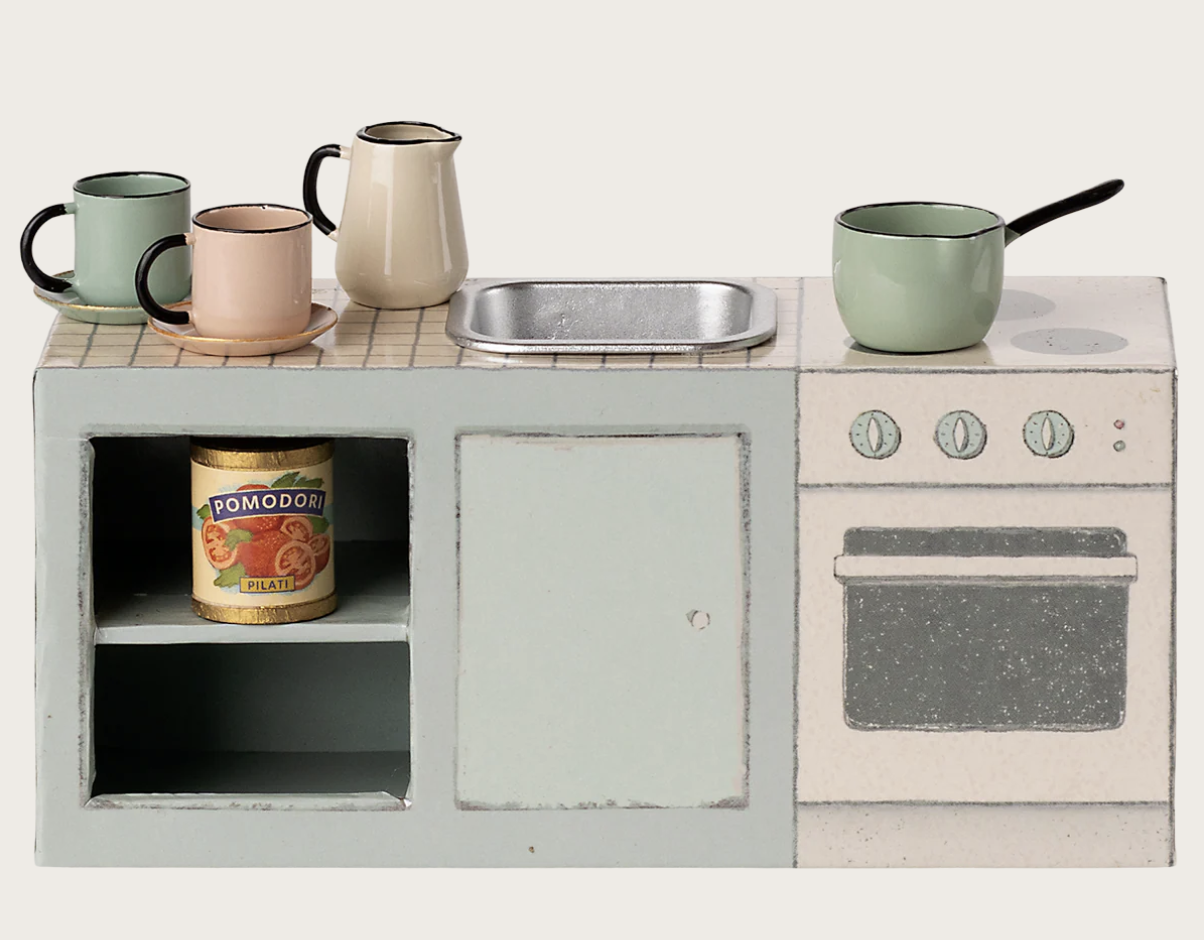 The small kitchen counter comes with 2 cups and 2 plates, a pot and a pitcher and a small can. The small sink is made of metal to look as real as possible. It fits perfectly into the kitchen in the SuitCasa mouse house.