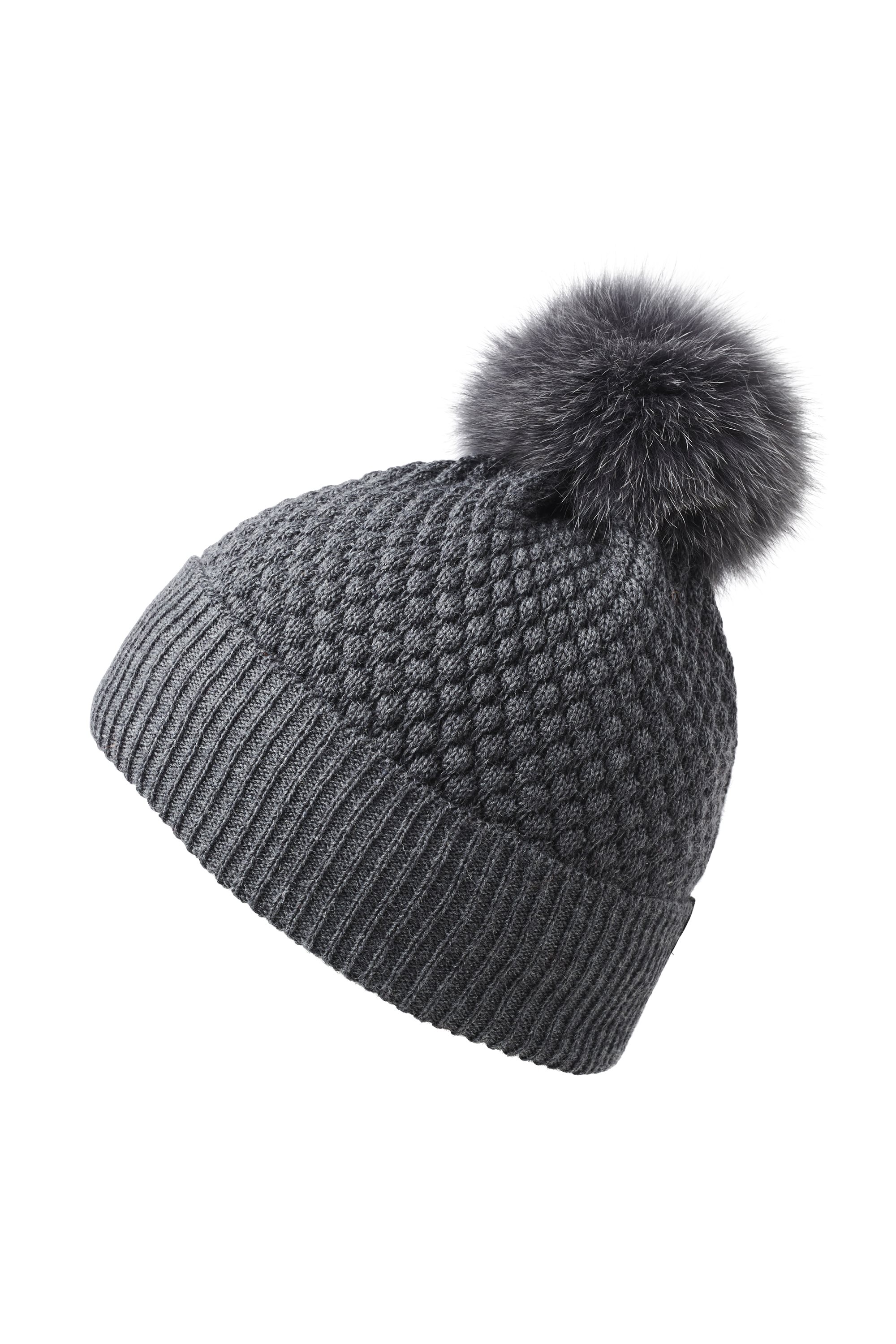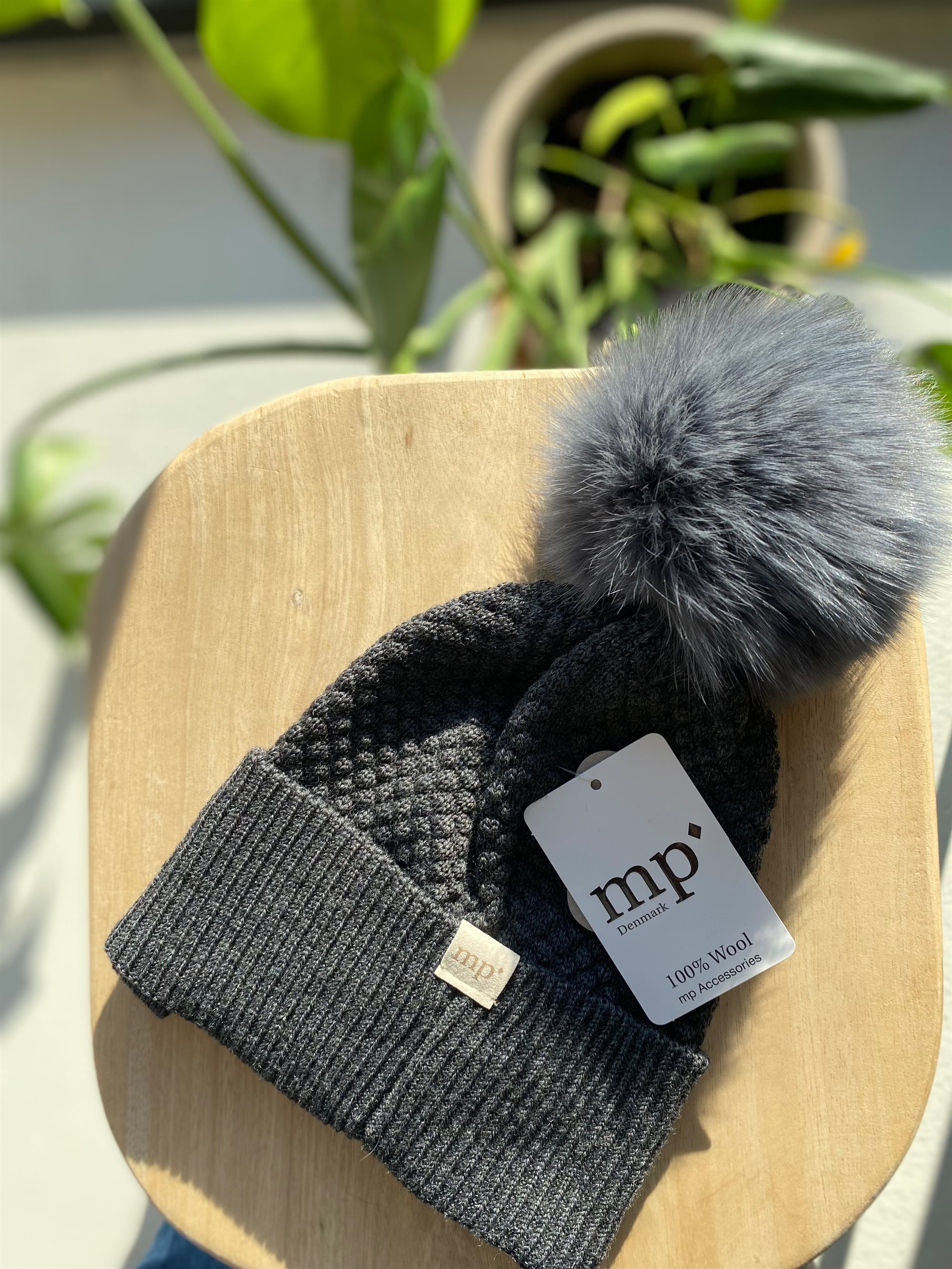Lækker MP uld strikket hue med pels pom pom i toppen. Huen er produceret i en lækker uld samt rundt i kanten af huen er der sat en blød fleece som fungerer som vindstopper og føles derudover rar mod huen.