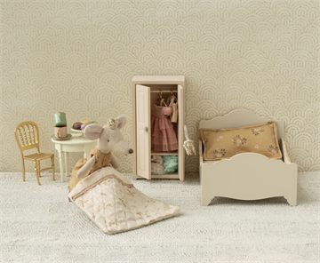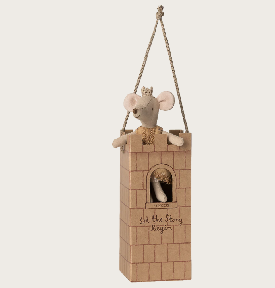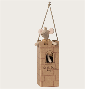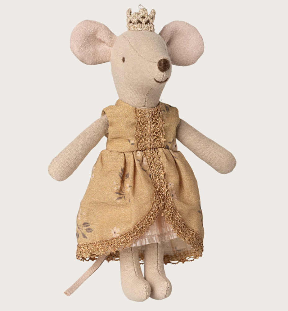 A real princess mouse in a big sister size. She is dressed up in her best dress with beautiful details and a golden crown. She fits perfectly into the Maileg castle.