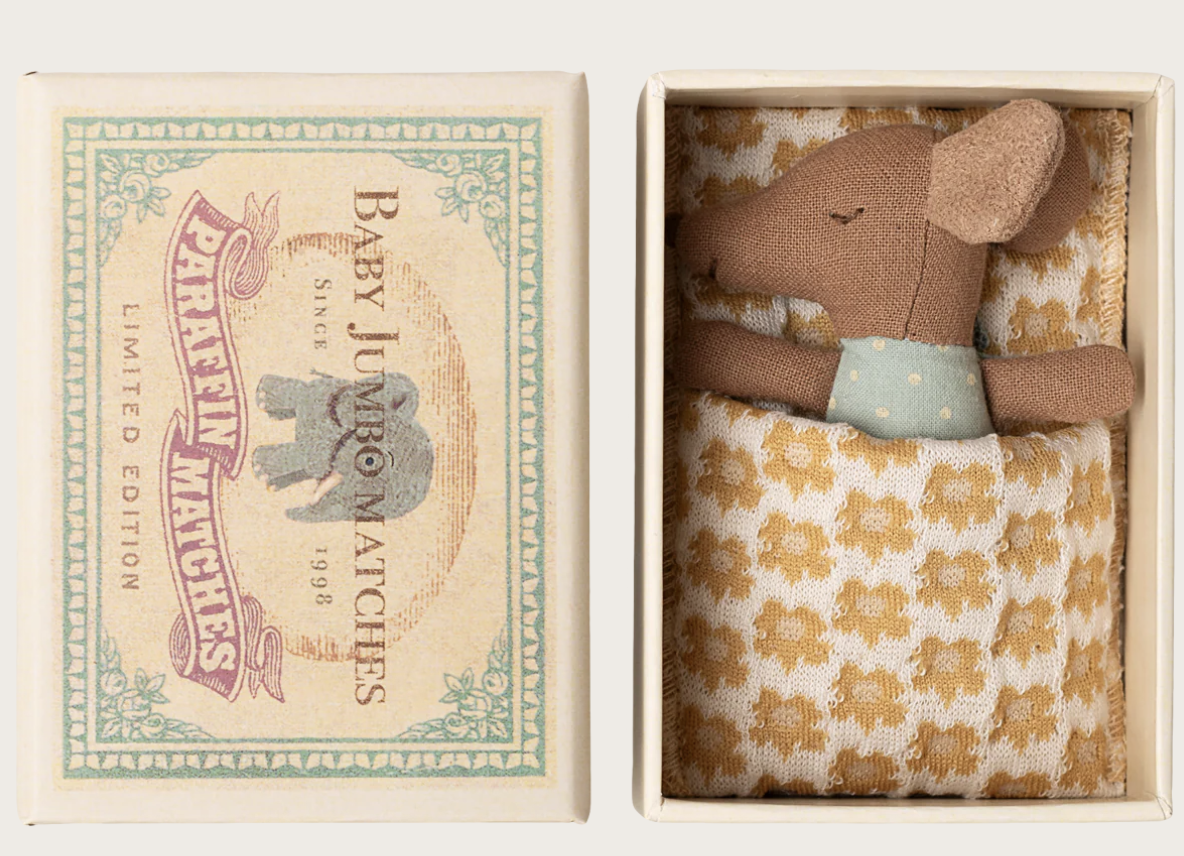 A classic Maileg item. This mouse is ready for hours of play and sleeps tight in the little matchbox. The clothes and bedlinen are made of soft fabrics with unique prints in beautiful colors.