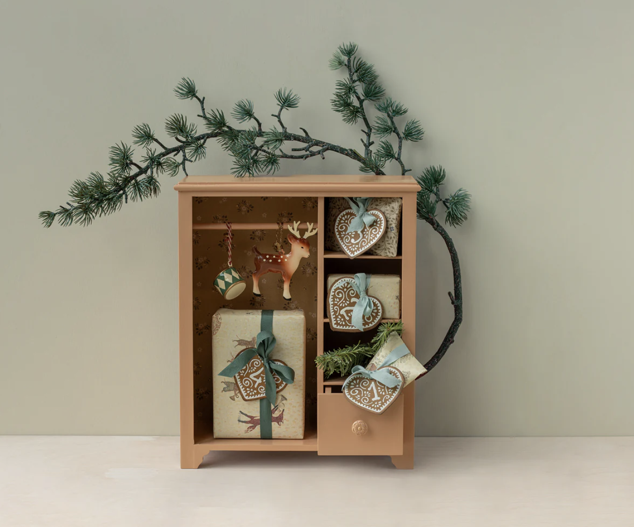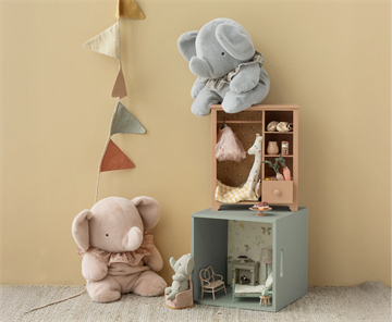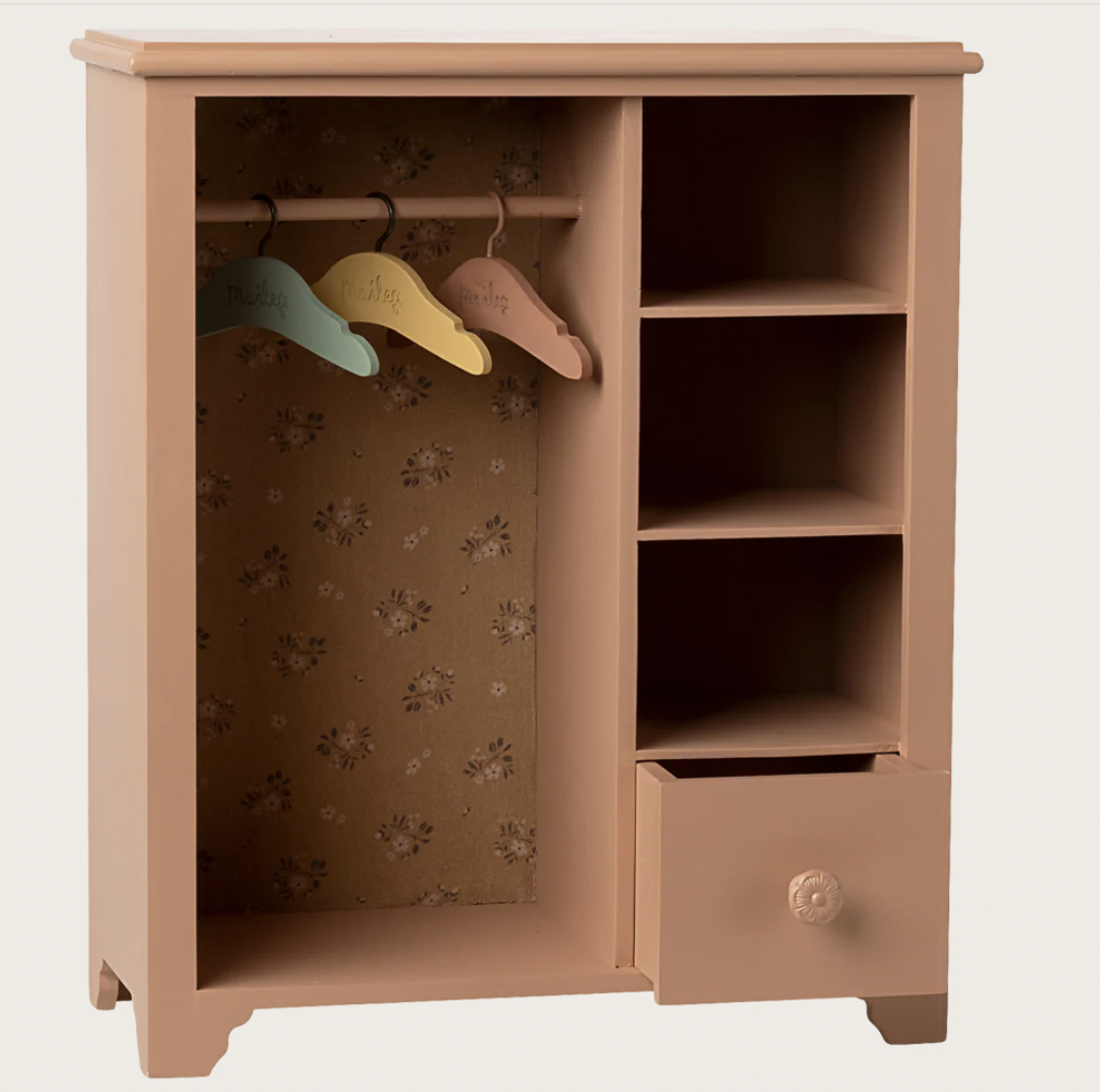 A wooden closet for bunny and teddy clothes or just for your favorite treasures. It has a great size to place anywhere in the childrensroom as it is too big for Maileg dollhouses.